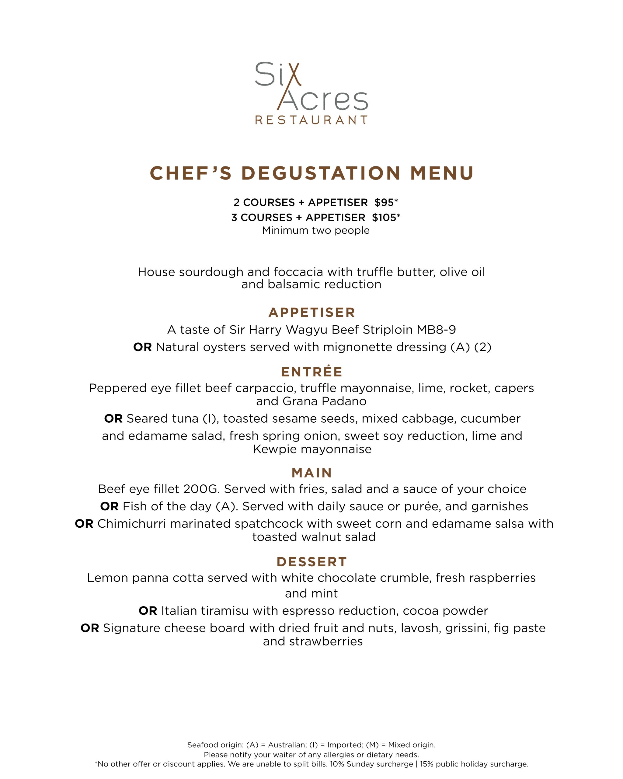 Embark on an unforgettable culinary journey with our Six Acres Chef’s Degustation, a carefully curated selection of dishes designed to showcase the finest seasonal ingredients and the artistry of our kitchen.